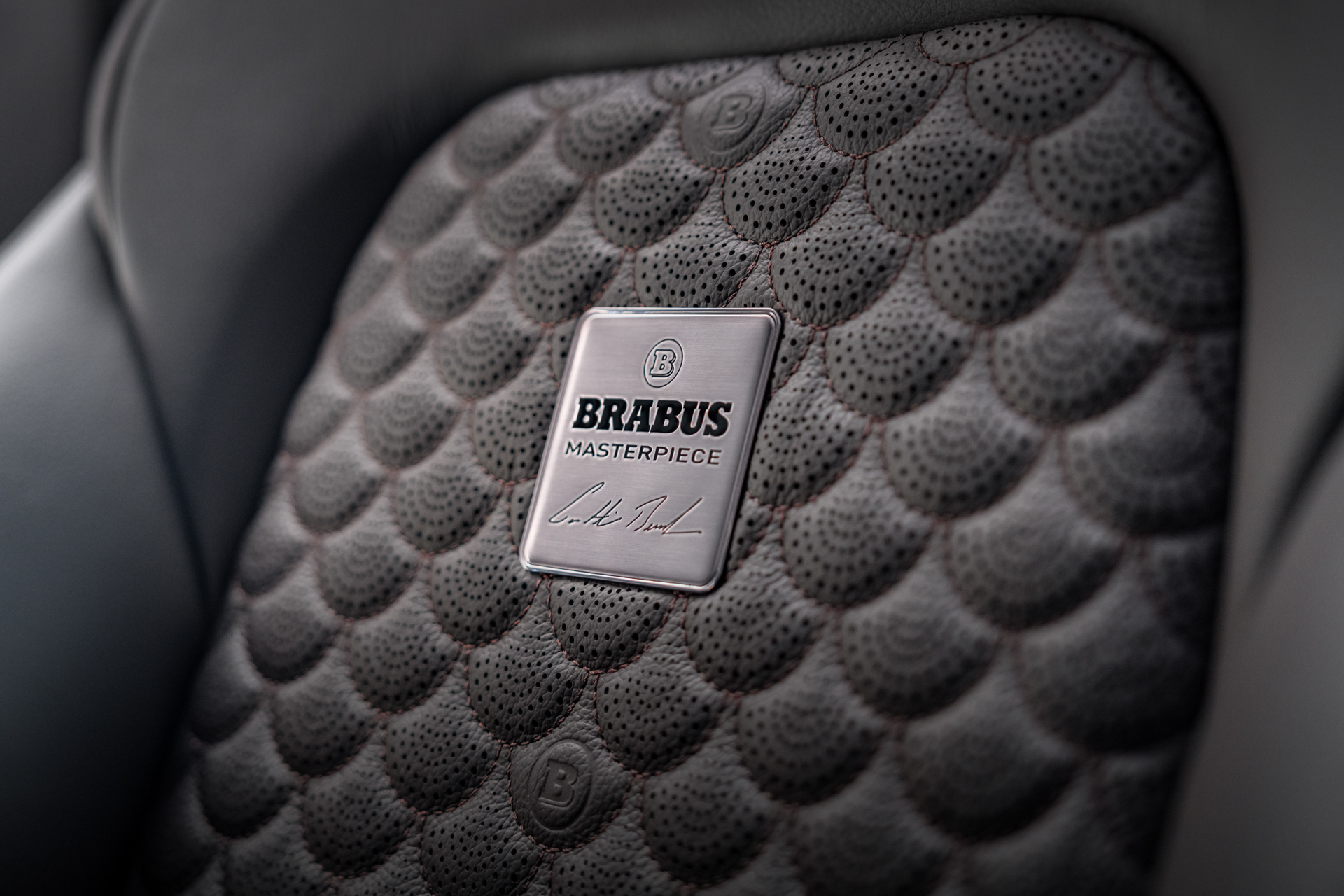 Die Türverkleidungen und hinteren Seitenverkleidungen wurden ebenfalls mit geprägten „Shell“ Elementen veredelt, die zusätzliche Tiefe und Struktur schaffen und sich elegant in das Gesamtdesign einfügen. Im Armaturenbrett ist eine Uhr mit einem markanten BRABUS Ziffernblatt integriert, die dem Innenraum ein weiteres exklusives Designdetail hinzufügt.