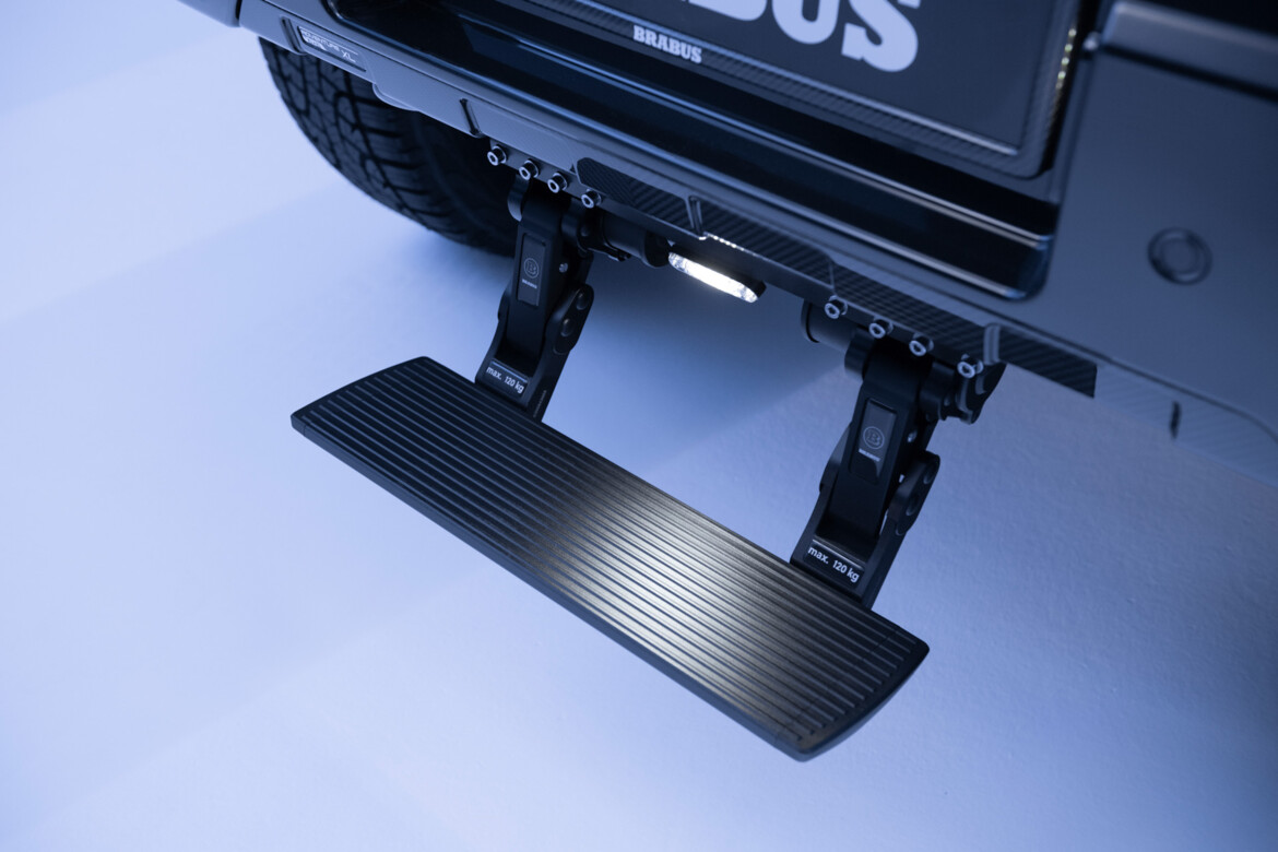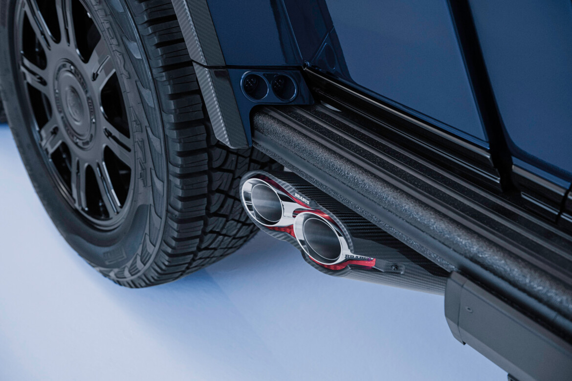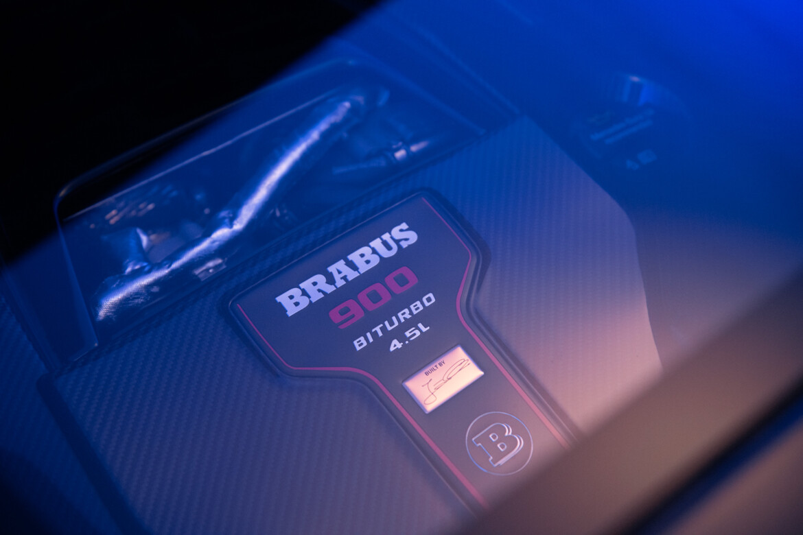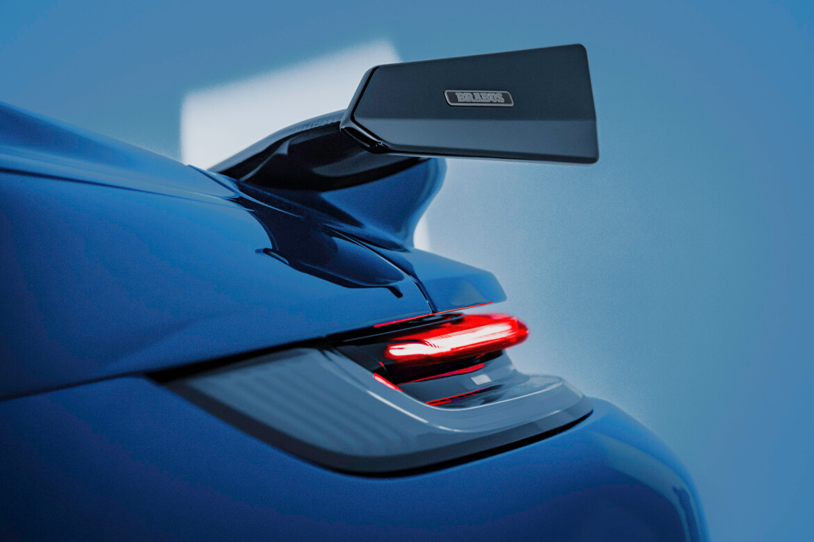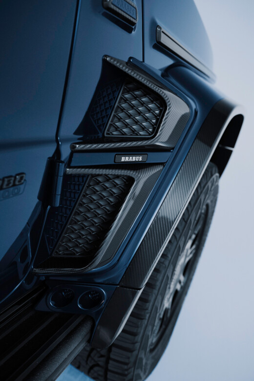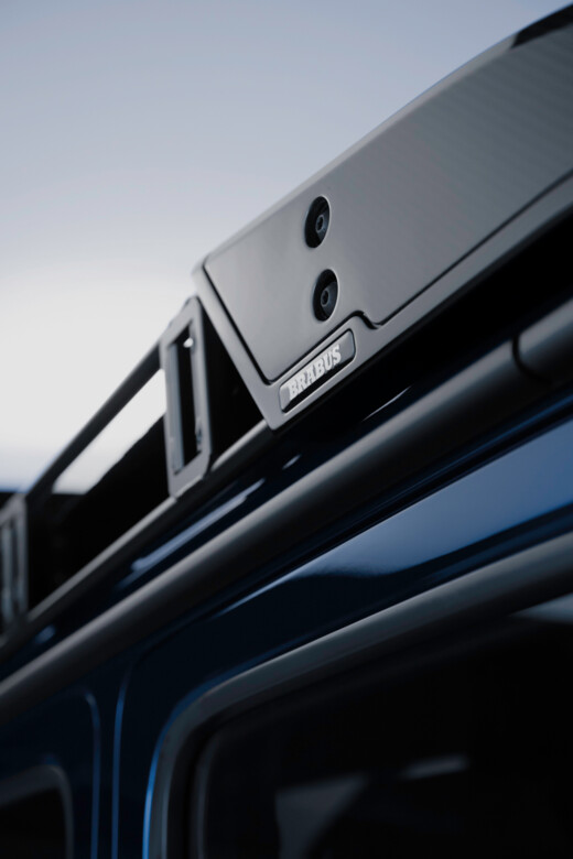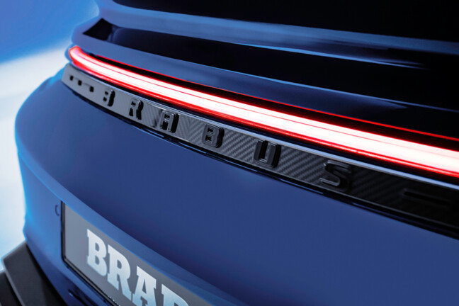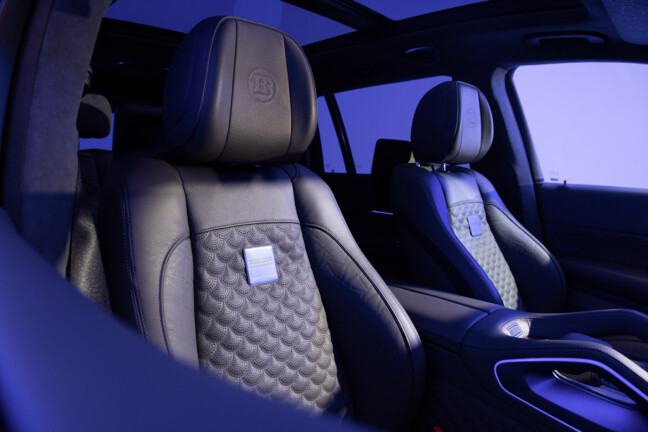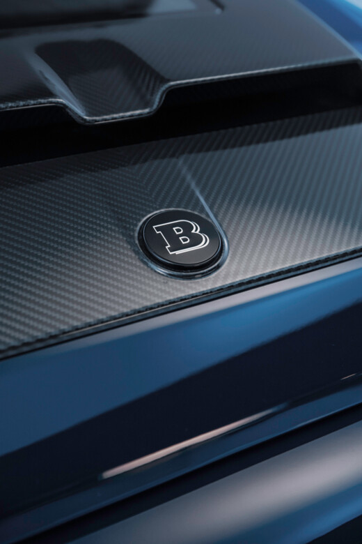 Der Innenraum wird zudem durch über 206 individuell glasierte Innenraumakzente noch exklusiver. Von den Schaltern und Lautsprecherabdeckungen bis hin zu den Lüftungsdüsen und Verkleidungen ist jedes Element mit einer auffälligen blauen Lasur versehen, die einen reizvollen Kontrast zur schiefergrauen Farbpalette bildet. Hochglanzversiegelte Carbon-Akzente, die in das Armaturenbrett, die Türverkleidungen und die Mittelkonsole integriert sind, sowie beleuchtete BRABUS Einstiegsleisten und eloxierte Aluminiumpedale vervollständigen das sportliche Ambiente.