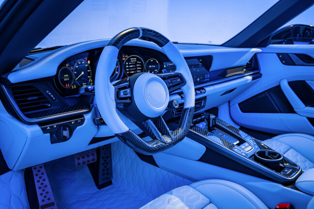 Im Innenraum bietet der BRABUS 900 DEEP BLUE einen Ozean aus maßgeschneidertem Luxus, der das dynamische Äußere des Supercars mit einem ebenso extravaganten 1-Second-Wow-Effekt geschmackvoll ergänzt. Das gesamte Cockpit ist mit feinstem BRABUS „Ice Blue“ Leder ausgestattet und mit exquisiten BRABUS „Ellipse“ Steppungen auf den Sitzflächen, Türverkleidungen und den Böden von Cockpit und Kofferraum versehen. Das elegante Ton-in-Ton-Design wird durch farblich abgestimmte Biesen und Ziernähte im gleichen Farbton unterstrichen und sorgt so für eine harmonische Ästhetik. Die Sitzflächen und Türverkleidungen sind zudem präzise perforiert, was dem luxuriösen Ambiente einen eleganten und atmungsaktiven Touch verleiht.