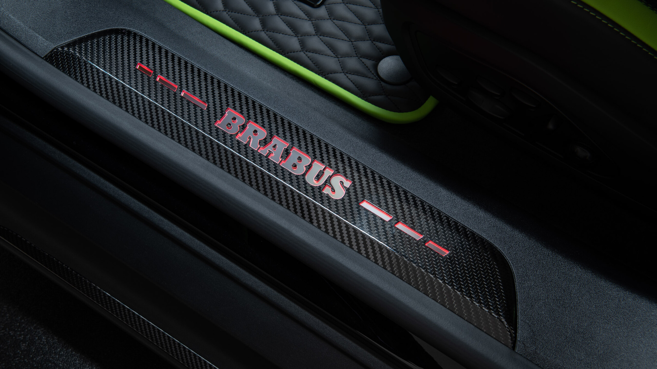 Die Einstiegsleisten aus hochwertigem Carbon (4-teilig) bestechen durch ihre klare Struktur und Eleganz. Das LED-beleuchtete BRABUS Logo erstrahlt in einem Farbwechsel von weiß auf rot.