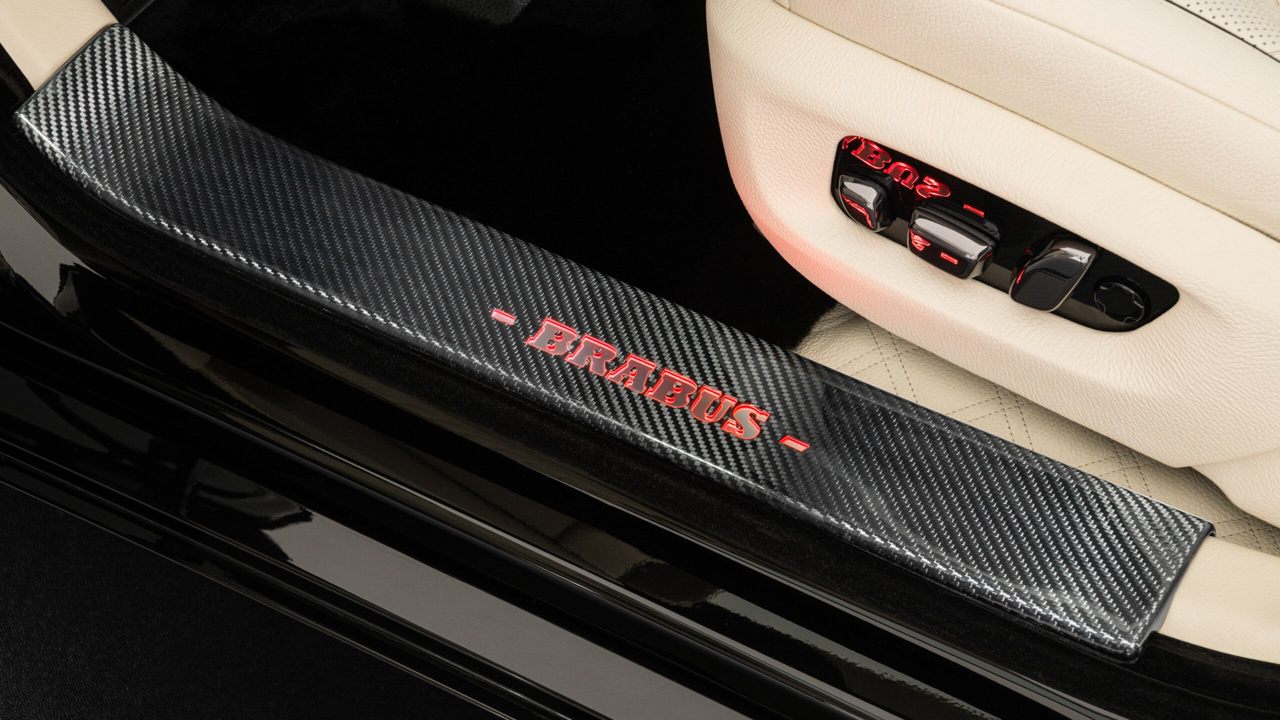 Die Einstiegsleisten aus hochwertigem Carbon bestechen durch ihre klare Struktur und Eleganz. Das LED-beleuchtete BRABUS Logo erstrahlt mit automatischem Farbwechsel von weiß auf rot.