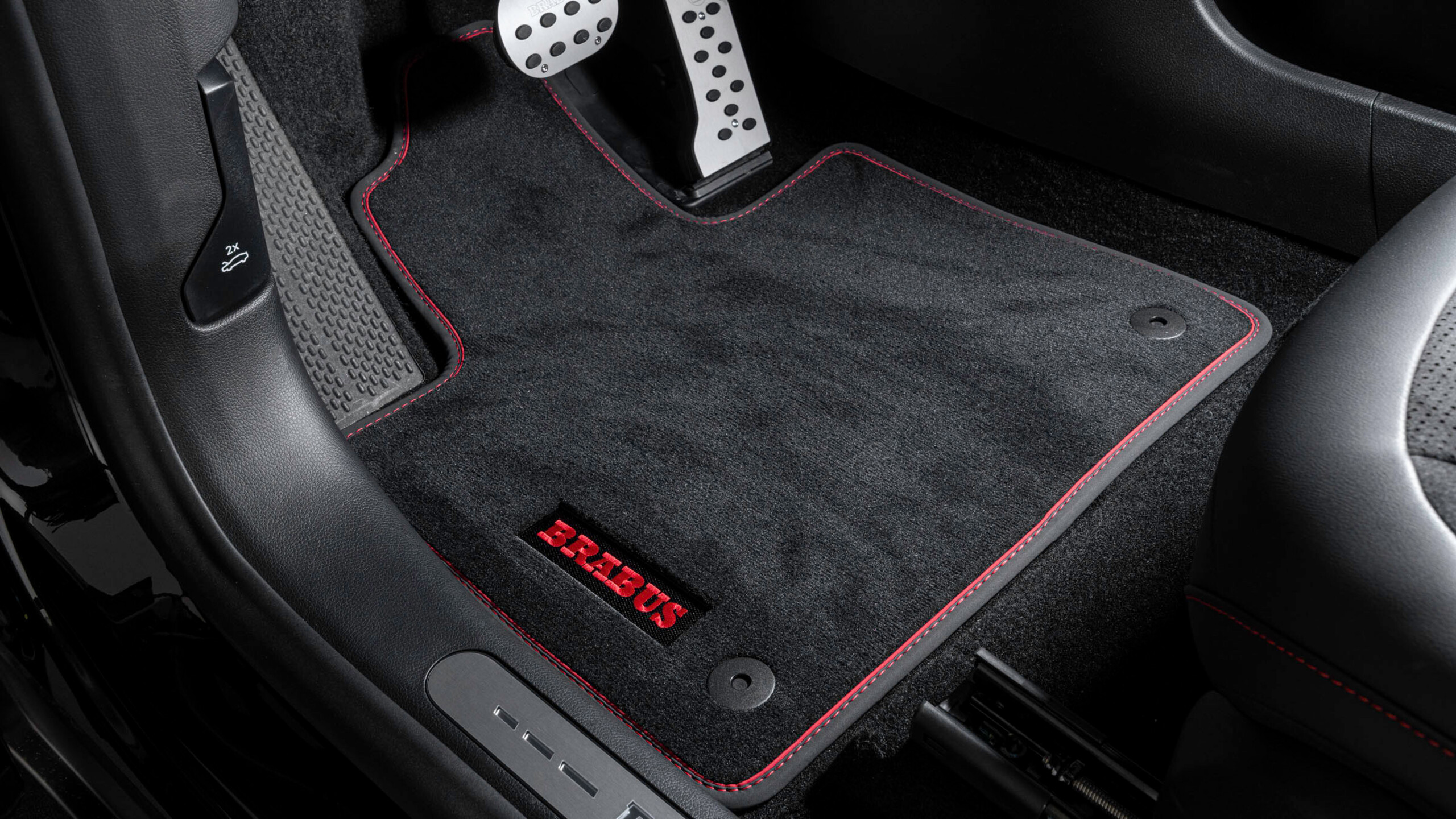 Fußbodenschoner aus Velours (dreiteilig) mit Nubuk-Keder Kante in schwarz und umlaufender Paspel sowie Naht und gesticktes BRABUS Logo in rot.