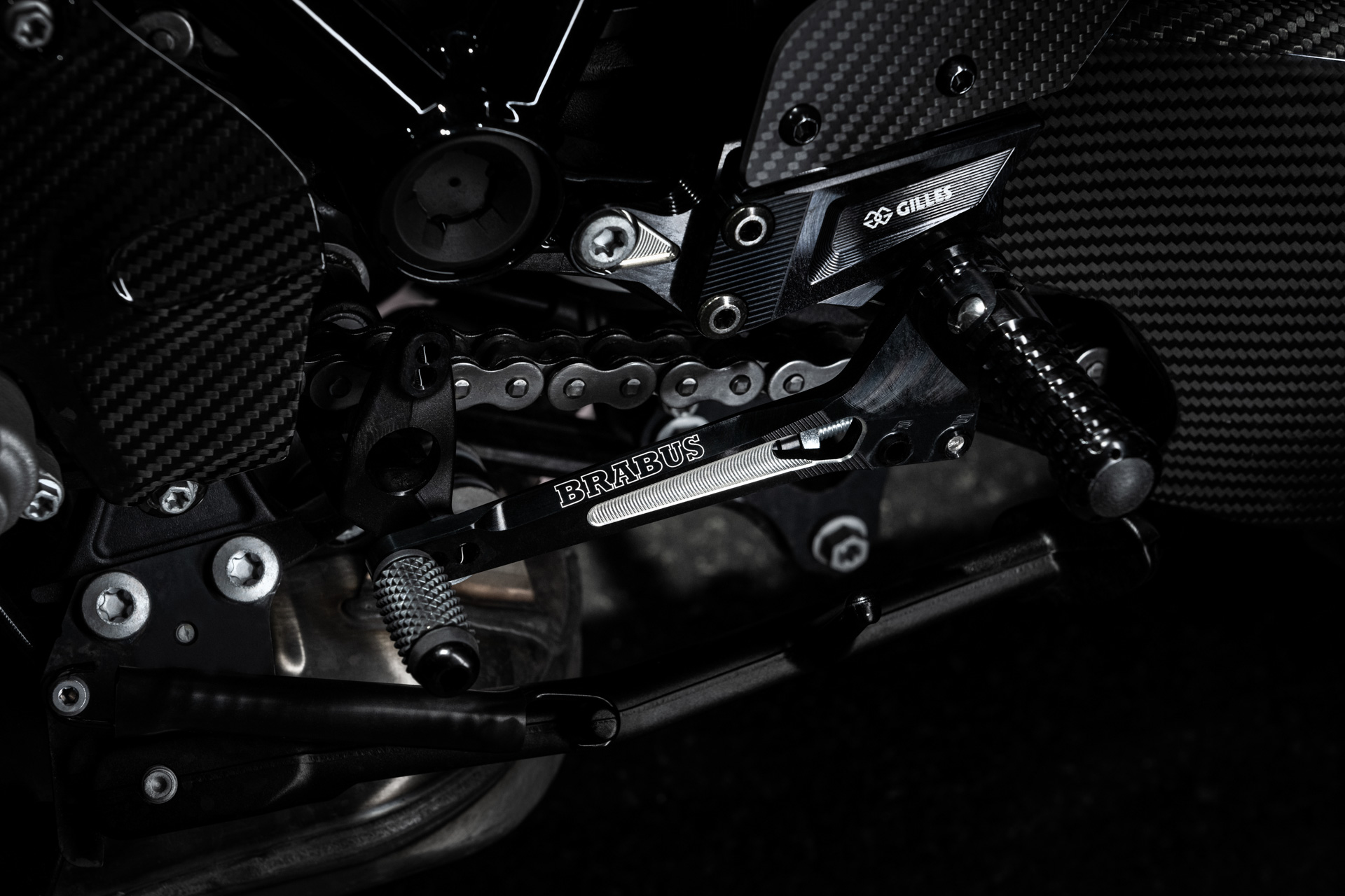 Our engineers developed a special slip-on underseat dual-pipe exhaust positioned beneath the carbon fiber undertray to highlight the 17-inch BRABUS Monoblock II EVO “PLATINUM EDITION” high-end wheels. Additional exposed structure carbon fiber features, such as the rear wheel cover, single swing arm cover and chain guard, complement the look.