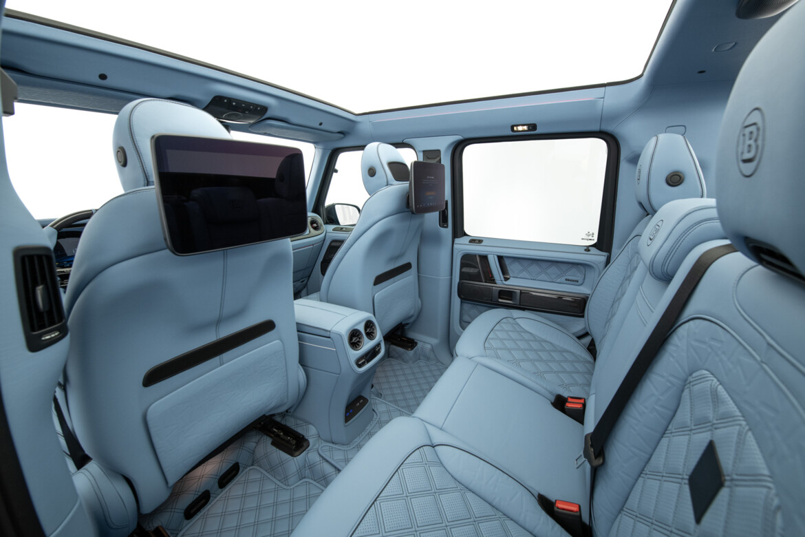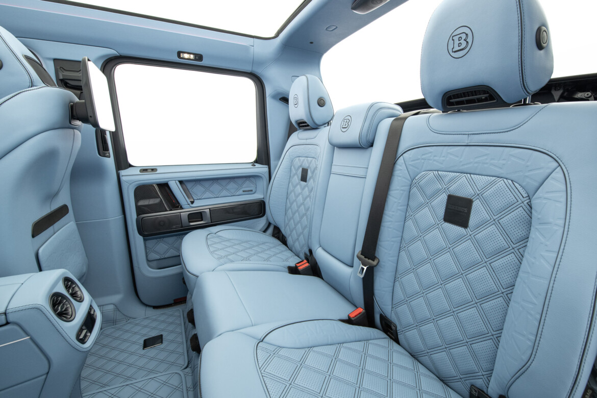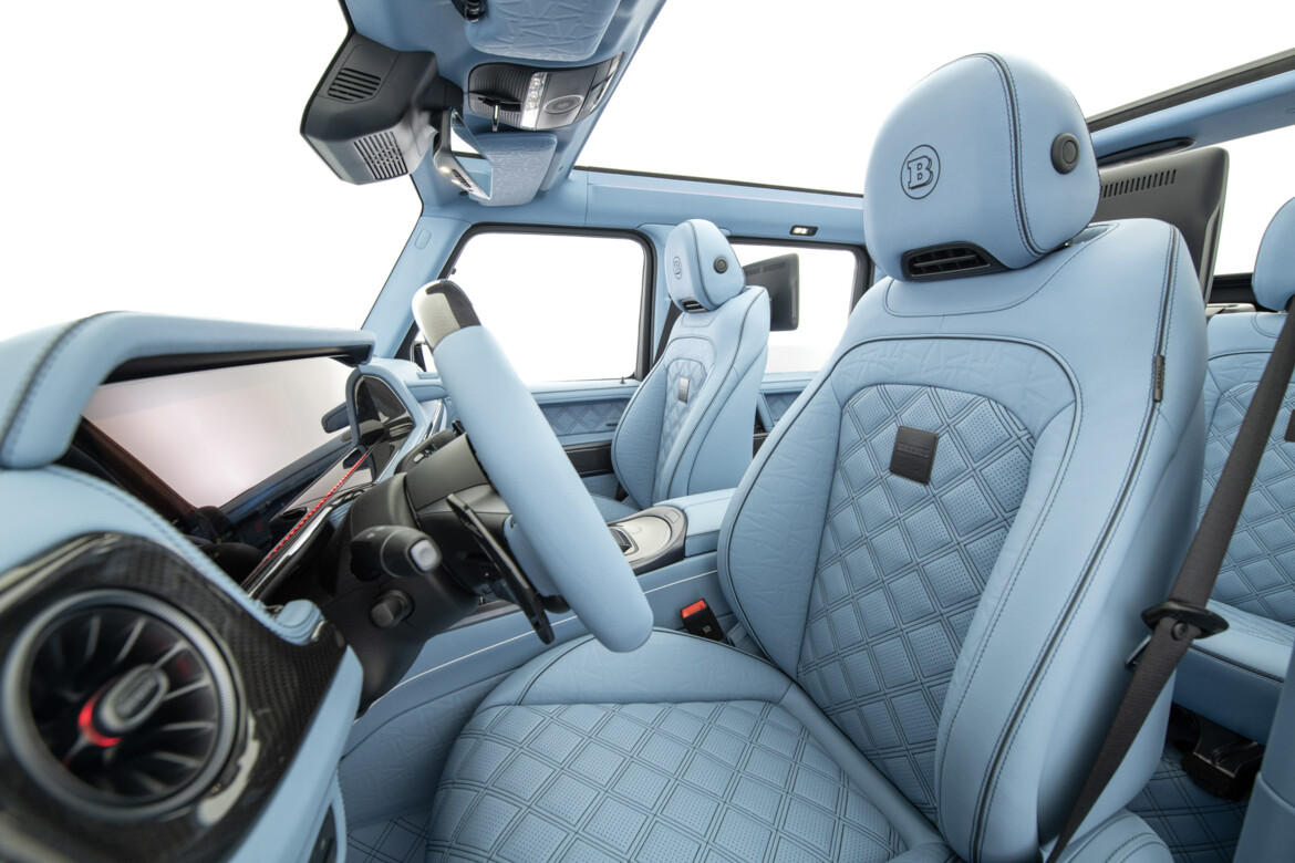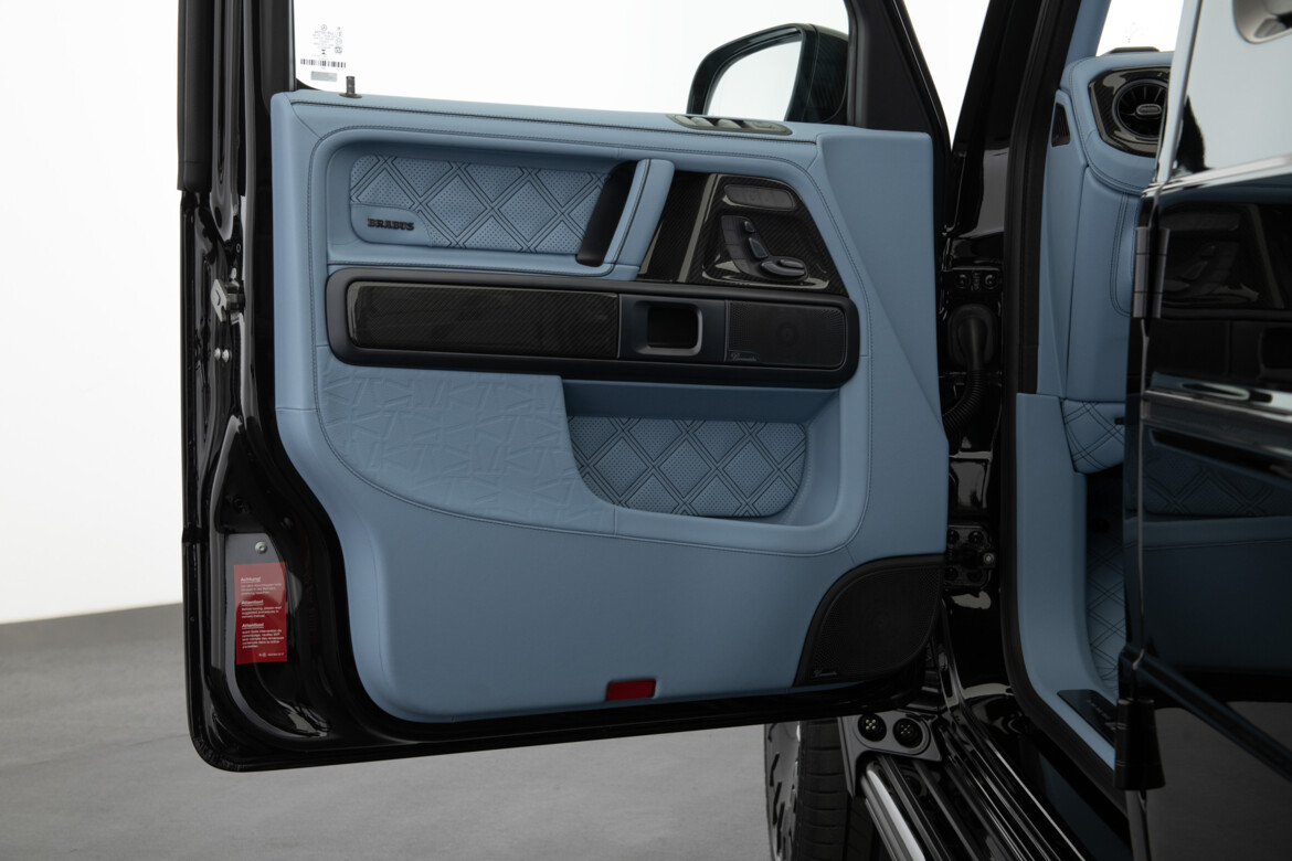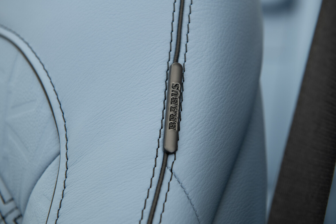 BRABUS Masterpiece leather in SKY BLUE with "Double Cube" quilting and perforation. Seats sides with BRABUS "Heritage 77" embossing. Piping and seams in black.