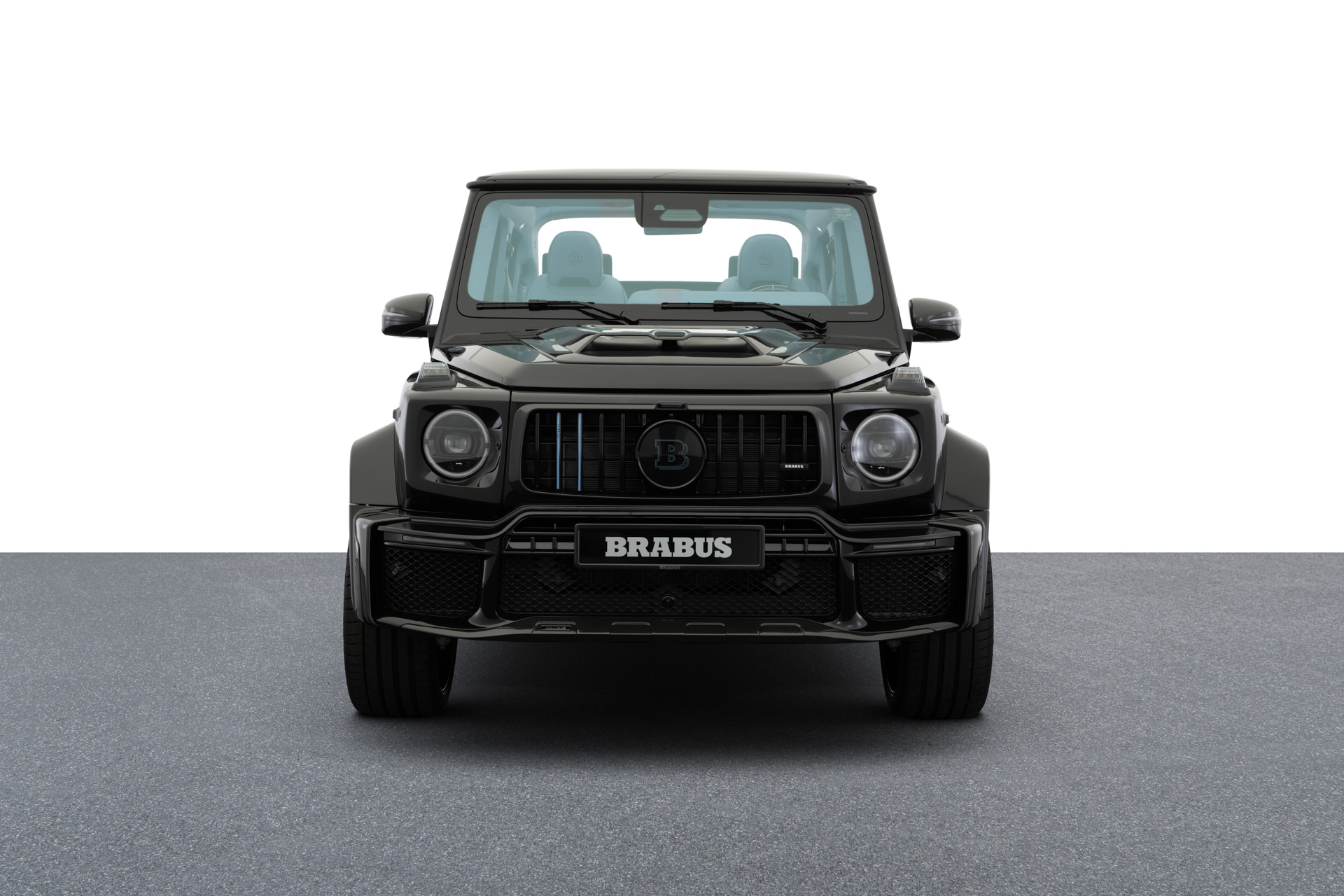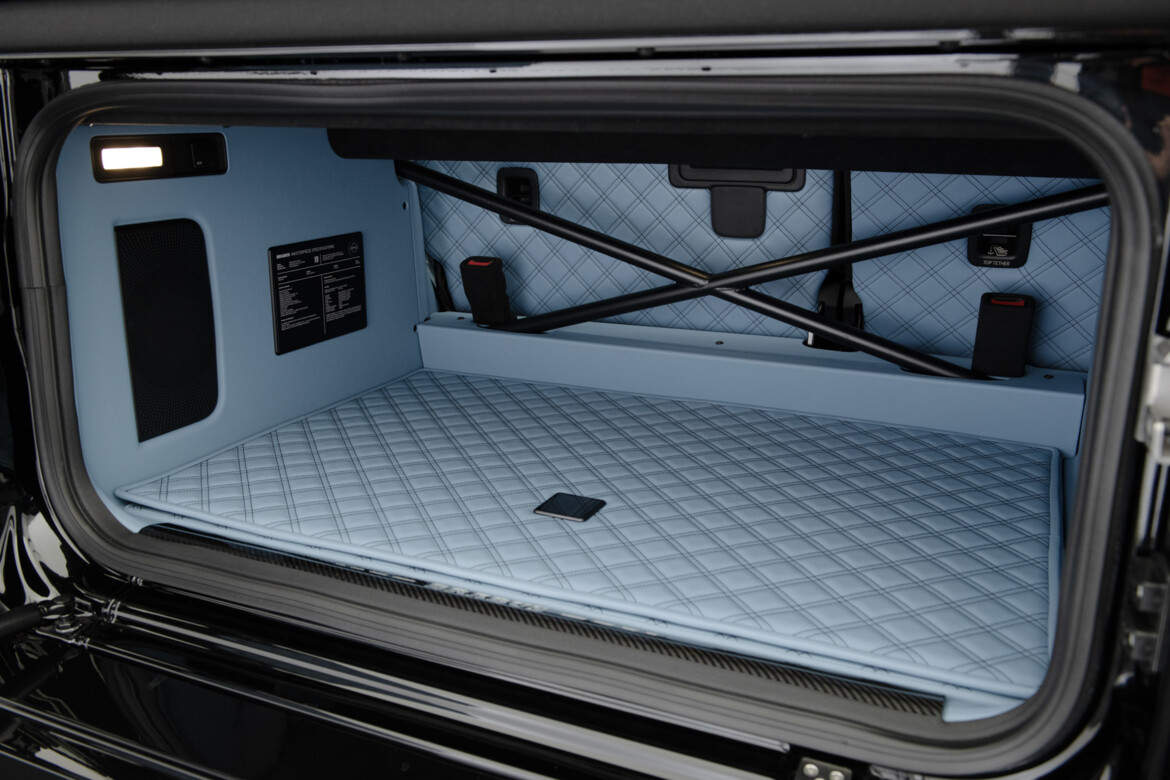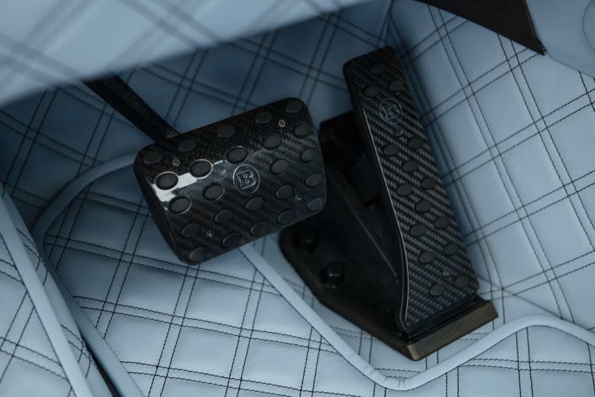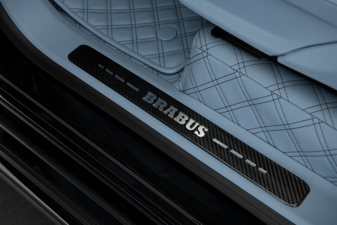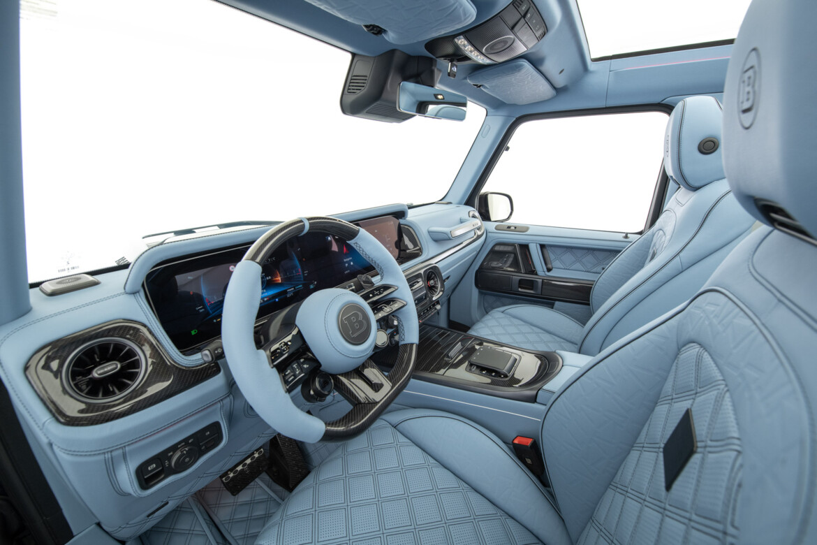 BRABUS Masterpiece leather in SKY BLUE with "Double Cube" quilting and perforation. Seats sides with BRABUS "Heritage 77" embossing. Piping and seams in black.
